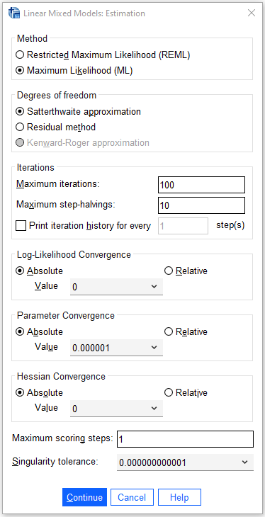 /CRITERIA = DFMETHOD(SATTERTHWAITE) CIN(95) MXITER(100) MXSTEP(10)